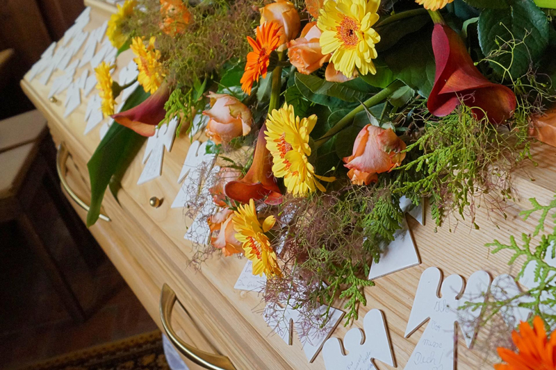 Auch wir selbst erleben immer wieder, wie die Engel die Trauerfeiern bereichern. Wir beobachten, wie Gäste innehalten und sich die vielen kleinen Engel in Ruhe am Sarg oder an der Urne anschauen und sich gegenseitig in den Händen halten. Dieses bewusste Handeln verwandelt stille Anteilnahme in etwas Greifbares. Für uns als Bestatter ist es besonders berührend zu sehen, wie diese kleinen Engel Momente der Nähe und Erinnerung schaffen – auf eine sehr sanfte, persönliche Weise.
